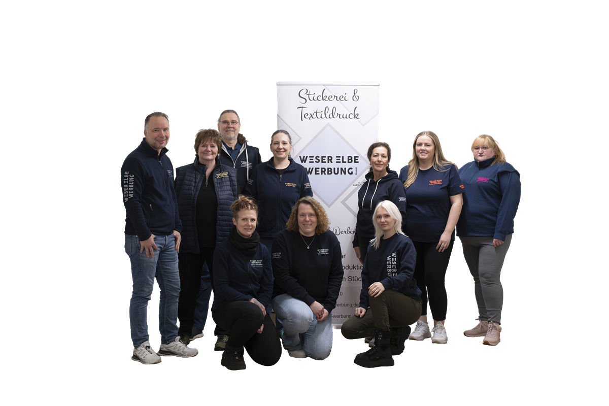 Weser Elbe Werbung steht für kreative Ideen, hochwertige Veredelung und zuverlässige Umsetzung – direkt aus der Region für die Region. Unser 10-köpfiges Team aus Gestaltern, Stickerei- und Werbetechnikprofis verbindet handwerkliches Können mit modernster Technik.